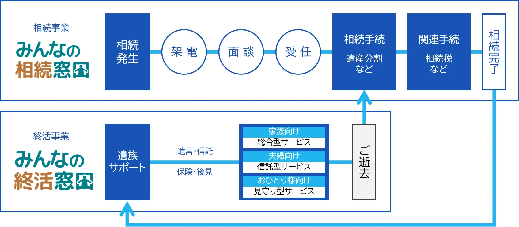 日本は今、少子高齢化に加えて、年間150万人以上が亡くなる“多死社会”を迎えています。こうした社会の中で、相続や終活に関する課題はますます重要になってきています。私たちは、相続や終活に不安を抱える方々のためのプラットフォーム「みんなの相続窓口」「みんなの終活窓口」を展開しています。多死社会の中でも、安心して暮らし続けられるよう、お客様に寄り添い続けるサポート体制を整えています。